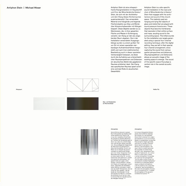 ANTIPHON STEIN ist eine ortsspezifische Klanginstallation im Hauptschiff und Chor der Minoritenkirche Krems/Stein, die sich mit der Architektur und dem Klang dieses Kirchenraumes auseinandersetzt. Das verwendete Material sind hängende und liegende Flächenobjekte aus Glas und Metall, über Körperschallwandler mit Klängen bespielt. Diese Objekte werden so zu Membranen, die, in ihrer gesamten Fläche und Masse in Schwingung versetzt, den Klang an den sie umgebenden Raum abgeben. Die in der Installation verwendeten Ausgangsklänge wurden zu einem großen Teil vor Ort mit einem speziellen vierkanaligen Aufnahmeverfahren hergestellt und nach ihrer elektronischen Bearbeitung auch in dieser speziellen Vierkanaligkeit belassen, da diese durch die Aufnahme aus unterschiedlichen Raumperspektiven und Distanzen ein akustisches Abbild des gegebenen Raumes entstehen lässt. Der Klang des spezifischen Raumes spielt somit eine zentrale Rolle im akustischen Gesamtbild.